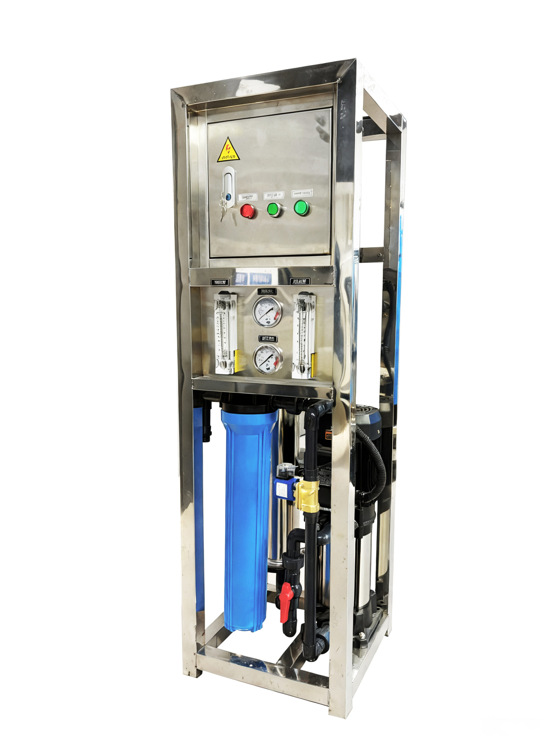 | Filtration Process | 1 × 20″ PP cotton filter 1 × 4040 RO membrane | 1 × 20″ PP cotton filter 2 × 4040 RO membrane | 1 × 20″ PP cotton filter 4 × 4040 RO membrane |